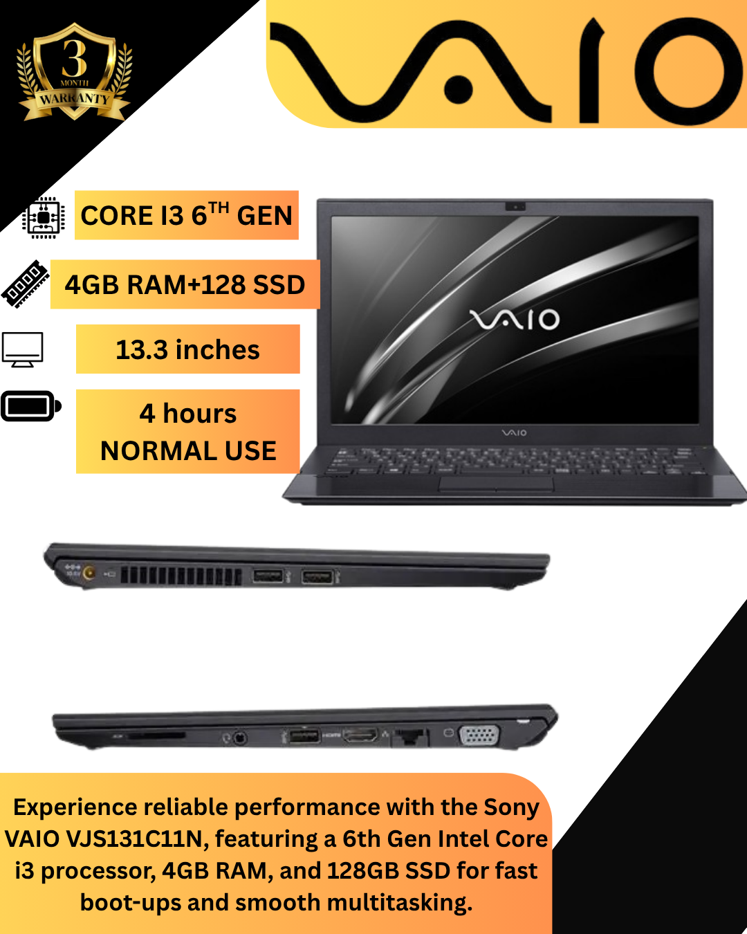 REFURBISHED:Sony VAIO VJS131C11N Laptop – Intel Core i3 6th Gen, 4GB RAM, 128GB SSD, Windows 10 – Lightweight & Compact Business Notebook